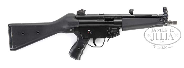 **COMPACT HECKLER & KOCH HK 94 / MP-5 NAVY (SHORT BBL RIFLE). SN 43-14696. Cal. 9mm. A fine 1988 date coded HK94 converted to an MP-5N by TSC Machine. It features a three lug and properly threaded (1/2×32) shortened Navy barrel (8.85″), anti-rattle paddle magazine release, and a front French sling loop. It has the stock HK94 semi-auto trigger group and internals. The SBR maker’s mark is by TSC Machine and shows on the left side of the receiver forward of the rear push pin under the trigger group. No magazines accompany this gun. This gun in on a form 4 in the state of Maine. CONDITION: Very Good to Fine. Metal surfaces retain most of their blue finish with a few minor surface mars on right side of trigger group. Synthetic stocks have just a few minor marks from light use. Mechanics are crisp with a bright shiny bore. 4-39973 JWD5 (5,000-7,000)