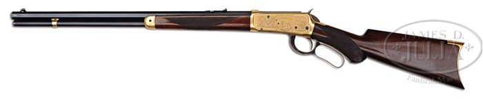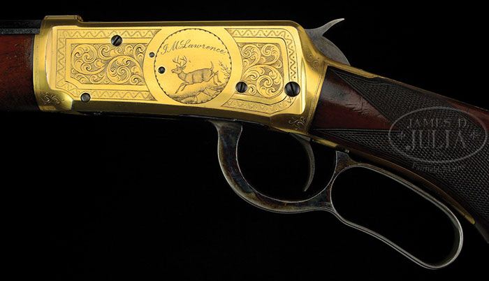 EXTRAORDINARILY RARE, ONE OF A KIND, SPECIAL ORDER FACTORY ENGRAVED WINCHESTER MODEL 1894 LEVER ACTION SHORT RIFLE. SN 64062. Cal. 30 WCF (30-30). According to a survey of the records of the Cody Firearms Museum, Buffalo Bill Historical Center, Cody, WY, regarding the production of the Winchester Model 1894 in the serial range “1 through 353,999″ there were only 22 arms of this model produced with non-standard wood and this rifle, listed by SN, is the only one produced with mahogany wood. Additionally there were only 2,252 produced with 22″ bbls and only 336 rifles were engraved. This survey also reports that there were only 56 gold plated or trimmed guns. This rifle has a 22″ oct bbl, full magazine, Lyman ivory bead front sight with screw and a 3-leaf platinum line express rear sight. Mounted with fine grained mahogany wood with H-style checkered 8-3/8” forearm and capped pistol grip stock with crescent buttplate. Receiver, forend cap, magazine band & buttplate are heavily gold plated. Receiver is factory engraved in style #9 with the vignettes of a running whitetail buck on left side surmounted by the script name “I.M. Lawrence” and the right side has a standing whitetail buck. Engraving extends over top & bottom, top tang, over chamber area of bbl and buttplate tang. Left side of lower tang, under the wood, is marked with assembly number “7962” and “XXX”. The matching assembly number is also found or rear face of buttstock and inside toe of buttplate. Accompanied by a Cody Firearms Museum letter identifying this rifle, as found, with octagon bbl (length not indicated), plain trigger, checkered pistol grip mahogany stock, $4.00 engraved and gold plated receiver with “I.M. Lawrence” on left side and “Monogram Ring”, received in warehouse July 12, 1899 and shipped same to Order #29660. Although this letter shows shipping in 1899 the receiver was actually manufactured in 1896. Also accompanied by a 2-page letter dated Sept. 14, 1998, over the signature of Lloyd Barden where he states that “Isadore Lawrence was a store owner in El Paso in the 1890s. The store was on the corner of San Francisco and Santa Fe Streets.” Mr. Barden describes an incident related to him by Mr. Lawrence’s grandson to whom this rifle was bequeathed, wherein Mr. Lawrence was robbed at gunpoint but shot and killed the robber. He also states that Mr. Lawrence moved to Middletown, NY where he died in 1950 and that a copy of his will named his grandson executor and heir and mentioned his shotguns, rifle & pistols. Also accompanying is a hand written letter from the late Tommy Rholes dated Feb. 6, 1999 wherein he authenticates this rifle as being completely original. Additionally accompanying is a copy of the Winchester ledger sheet for this rifle and copies of pages of the aforementioned survey. PROVENANCE: Wes Adams Estate Collection. CONDITION: Very fine. Bbl & magazine tube retain 97-98% strong orig blue with only light sharp edge wear and a small ding on magazine tube; forend cap retains about 98% gold finish; receiver retains 97-98% strong orig gold finish and the buttplate about 93-95% gold plating; hammer retains most of its orig strong case colors turned silver on top edge; lever retains brilliant case colors on sides, fading to silver on outer faces. Wood is sound and retains most of an old restored finish. Mechanics are crisp, bright shiny bore, frosty in the grooves. 4-44375 JR29 (40,000-70,000)