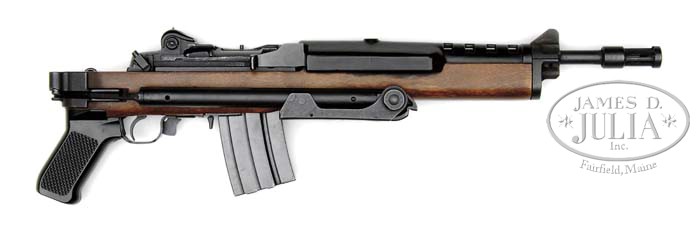 **FACTORY SHORT BARREL SIDE FOLDING RUGER AC556K (Fully Transferable). SN 191-12654. Cal 223. Desirable Ruger select fire 3-position selector(semi, 3-rnd burst, full auto) with factory Ruger side folding stock with 13″ bbl. Firearm has correct gas block to indicate factory side folding stock. Factory muzzle break/flash hider. Comes with factory box and factory 20-rnd Ruger magazine. CONDITION: Firearm is clearly used but in very nice condition with minor surface scratches from normal handling and storage. Rifling is sharp. Mechanism functions smooth and correct when cycled by hand. 4-44955 JZ1 (4,500-6,500)