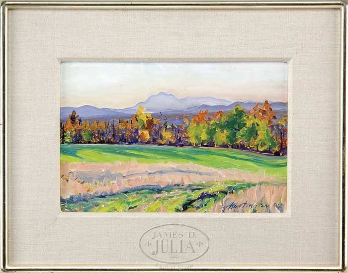 CHRISTOPHER HUNTINGTON (American, 1938-) “AFTERNOON-AUTUMN-ENDS”. Oil on wood panel colorful scene shows a view looking from the Summet Farm in Stacyville, Maine. The view overlooks grass field to colorful trees to Mount Katahdin. The reverse has title, signature, location and date (Oct. 1994). Signed and dated lower right. Housed in a gilt wood frame with wide linen matte. SIZE: 12″ x 18″. CONDITION: Very good to excellent. 9-99850 (1,500-2,000)