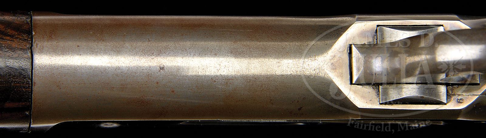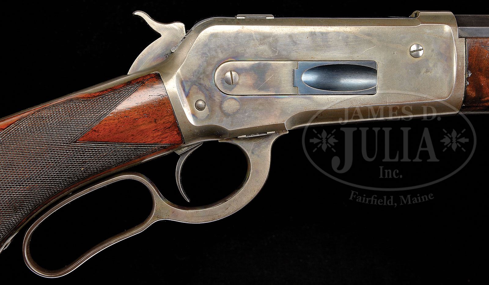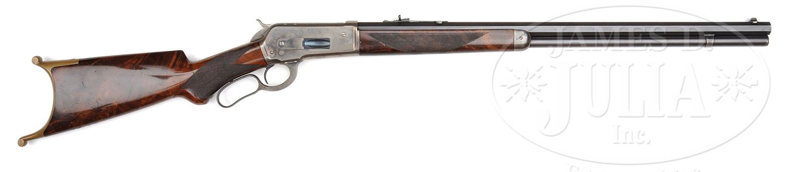 SCARCE DELUXE SPECIAL ORDER WINCHESTER MODEL 1886 LEVER ACTION RIFLE. SN 77640. Cal. 38-56. Special order deluxe ’86 with 26″ oct bbl, full magazine, Lyman ivory bead front sight & semi-buckhorn rear sight. Mounted with very highly figured, 2-3X American walnut with H-style checkered forearm & black insert, serpentine grip buttstock that has a brass Swiss buttplate. Left side of the lower tang is marked “XX” & the assembly #731. Matching assembly number is also found in top tang channel of buttstock & inside center of buttplate. Buttplate is without trap although stock is milled for a trap. PROVENANCE: Woody Frey Collection. CONDITION: Very fine. Bbl & magazine tube retain 97-98% strong orig blue, turning slightly plum on magazine tube. Receiver retains bright case colors in the most sheltered areas and overall 60-70% faded case colors with the top and bottom edges turned silver. Hammer retains strong case colors on the sides, mostly turned silver. Lever retains case colors in the most sheltered areas, mostly turned silver. Buttplate retains silver on the inside with the outside a dark brass patina. Wood is sound with usual light nicks & scratches in the finish & a series of small gauges around the toe & overall retains most of it’s bright, orig piano varnish finish, slightly dulled on forearm. Checkering shows moderate wear. Mechanics are crisp. Bright, shiny bore. 4-48428 JR176 (15,000-25,000)