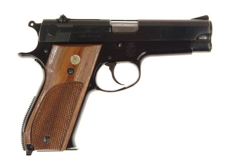 *TEXAS SHERIFF USED EARLY SMITH & WESSON MODEL 39 SEMI-AUTO PISTOL. Cal. 9 mm. SN 6063. This pistol was the property of Texas Harris County Sheriff C.V. “Buster” Kern. Pistol has blue finish, very early model with long extractor and checkered medallion walnut grips. A notarized statement accompanies it from Marie Kern, wife of Sheriff Kern, wherein she states that this pistol was the property of her husband and that she has given it to J. Lewis Edwards of Houston, Texas. Also included is a memo from Cletus Brown Jr. of Mossleigh Farm, Brookshire, Texas advising “Lew” that the affidavit signed by Mrs. Kern regarding this pistol was enclosed. Also accompanying is the orig envelope postmarked Sept. 3, 1991. CONDITION: Extremely fine, near new. Retains virtually all of its bright orig factory finish to metal & grips. Possibly unfired. 4-53888 JR515 (800-1,500)