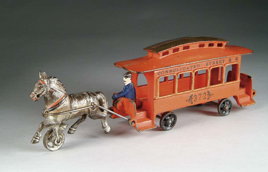 WILKINS (372) TROLLEY. A red trolley car topped by a gold raised roof is stamped “CONSOLIDATED STREET R. R.,” followed by “372” below on either side. The silhouette driver is enameled in blue, gray, and white and is being pulled by a silver horse with red harness. This toy is an extremely rare find. SIZE: 13”. CONDITION: Trolley car is very excellent, some wear to the horse. MC 1-3891 (1,400-1,800) Auction: Advertising, Toy & Doll - Spring 2005 Please Note: All prices include the hammer price plus the buyer’s premium, which is paid by the buyer as part of the purchase price. The prices noted here after the auction are considered unofficial and do not become official until after the 46th day. |