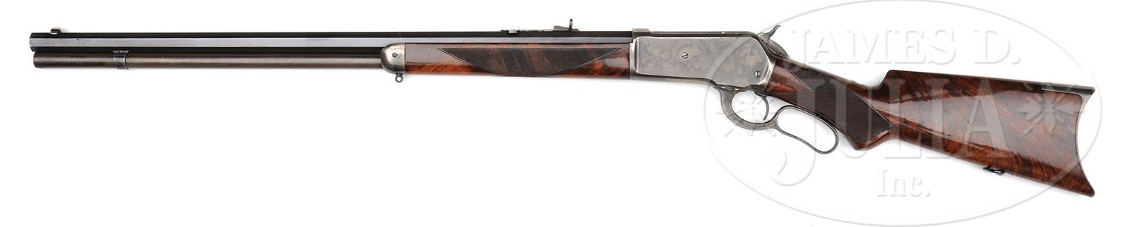 SCARCE WINCHESTER MODEL 1886 DELUXE LEVER ACTION RIFLE. SN 73335. Cal. 45-90. Fine deluxe ’86 with 26″ oct bbl, full magazine, half nickel front sight & semi-buckhorn rear sight. Mounted with highly figured, center crotch, flame and shell grain American walnut with H-style checkered forearm and black insert, serpentine grip buttstock with crescent buttplate. Buttstock has a factory sling swivel with sling eye in the forend cap. Buttplate is without trap, although the buttstock is drilled and cut for a trap. Left side of lower tang, under the wood is marked “XX” & the assembly number “373”. Matching assembly number is also found in top tang channel of buttstock. Buttplate has assembly number “252” inside the toe. It is unclear why the buttplate is mismatched as it fits absolutely perfectly. PROVENANCE: Woody Frey Collection. CONDITION: Fine to very fine. Bbl retains about 95% strong orig blue, turning a little plum with sharp edge wear and a couple of scratches. Magazine tube is mostly a thin blue brown patina. Receiver retains about 75% faded case colors, primarily on the sides with stronger colors in the most sheltered areas. Top of receiver retains smoky case colors with the belly faded to silver. Forend cap retains most of its orig case colors, moderately to heavily faded. Hammer retains bright case colors on the right side and rear edge, faded on the left side. Lever retains strong case colors on sides, faded to silver on outer faces. Buttplate is faded to silver. Wood is sound with usual handling & storage nicks & scratches and retains most of its bright, orig piano varnish finish, showing light diamond point wear. Mechanics are fine. Bright, shiny bore. 4-48426 JR177 (15,000-25,000)