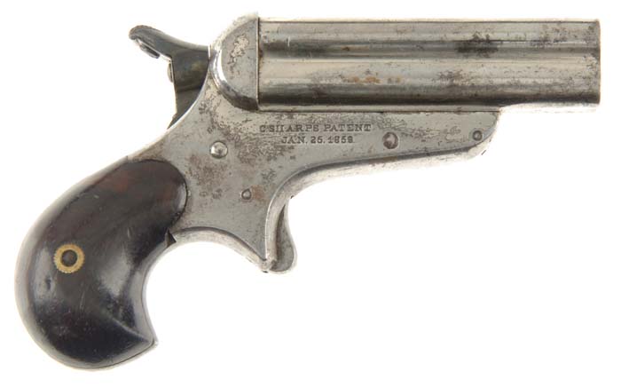 SHARPS MODEL 4C FOUR BARREL PISTOL. Cal. 32. SN 13651. 3” fluted bbls. Standard 2-line marking on right side of frame. CONDITION: 40% nickel overall mixed with light surface rust and pitting. Rosewood grips are worn smooth at high spots Mechanically needs adjustment. 4-30464 FS86 (500-1,000)