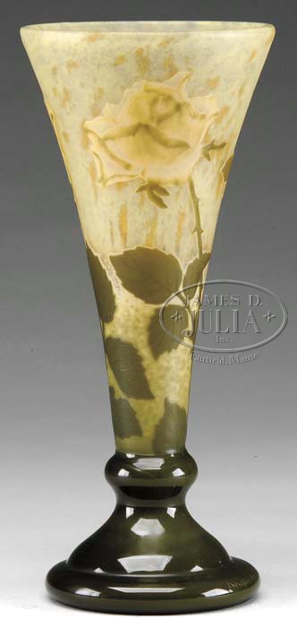 DAUM NANCY PADDED ROSE VASE. Elongated trumpet shaped vase begins with an olive foot from which three roses emanate from in various stages of bloom. Coloration of roses are very pretty in a soft pink and olive. All of this is on a mottled yellow and coral ground. Signed on the side of the foot “Daum Nancy France” with Cross of Lorraine. SIZE: 12-3/4″ t x 5-1/2″ at the mouth. CONDITION: Very good to excellent. 5-62174 (10,000-15,000)
