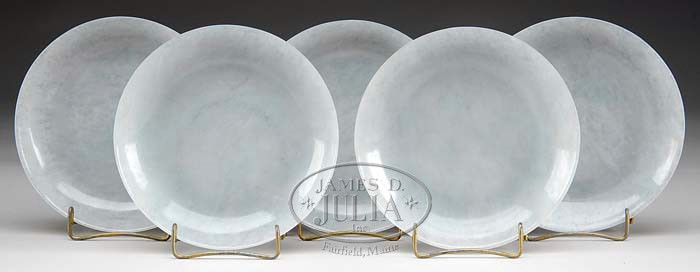 FIVE CHINESE MUTTON-FAT JADE CIRCULAR FOOTED DISHES. 19th century. SIZE: Each 6″ dia. PROVENANCE: Woolworth Collection (F.W. Woolworth Department Store). CONDITION: One dish with “Y” shaped inclusion. Otherwise all very good. 9-94564 (1,500-3,000)