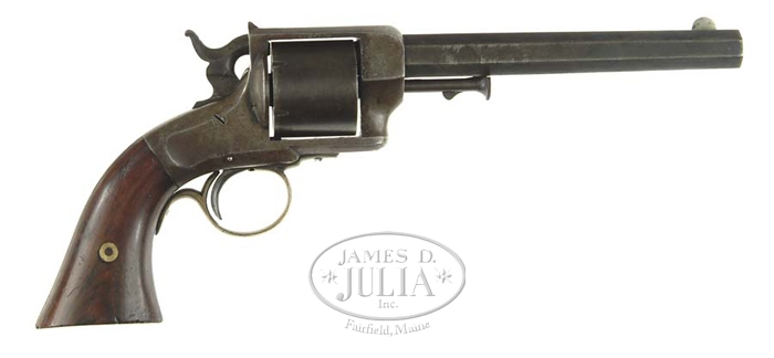PRESCOTT BELT REVOLVER. Cal. 38RF. SN 396. 6”oct bbl. The cylinder has another number 170 on the rear surface but the number on the front matches. Marked “E. A. PRESCOTT. WORCESTER. MASS / PAT’D. OCT. 2. 1860” on top of the bbl. Iron frame, brass trigger guard. CONDITION: 25% blue on the bbl & traces on the cylinder. Gray patina with dents and light surface rust elsewhere. Left grip is missing a small chip at the toe and both are somewhat battered. Mechanically fine. 4-57217 FS65 (500-800)