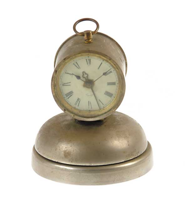 VERY RARE PARKER ALARM CLOCK. Parker also made a great number of items including coffee grinders and coffee mills, but this is the only alarm clock by Parker that we have ever handled. The small, round nickel-plated clock with white enamel type dial marked on the front in a diamond “Parker”, above it “Trademark”. The half-round base makes up the bell portion for the alarm leads to the 19th century. SIZE: Approx. 4” h, dia of base 3-3/4”. CONDITION: The clock runs, and the nickel surface clockworks alarm-not sure about the alarm nickel plating molding but generally good condition. 4-50175 (550-750)