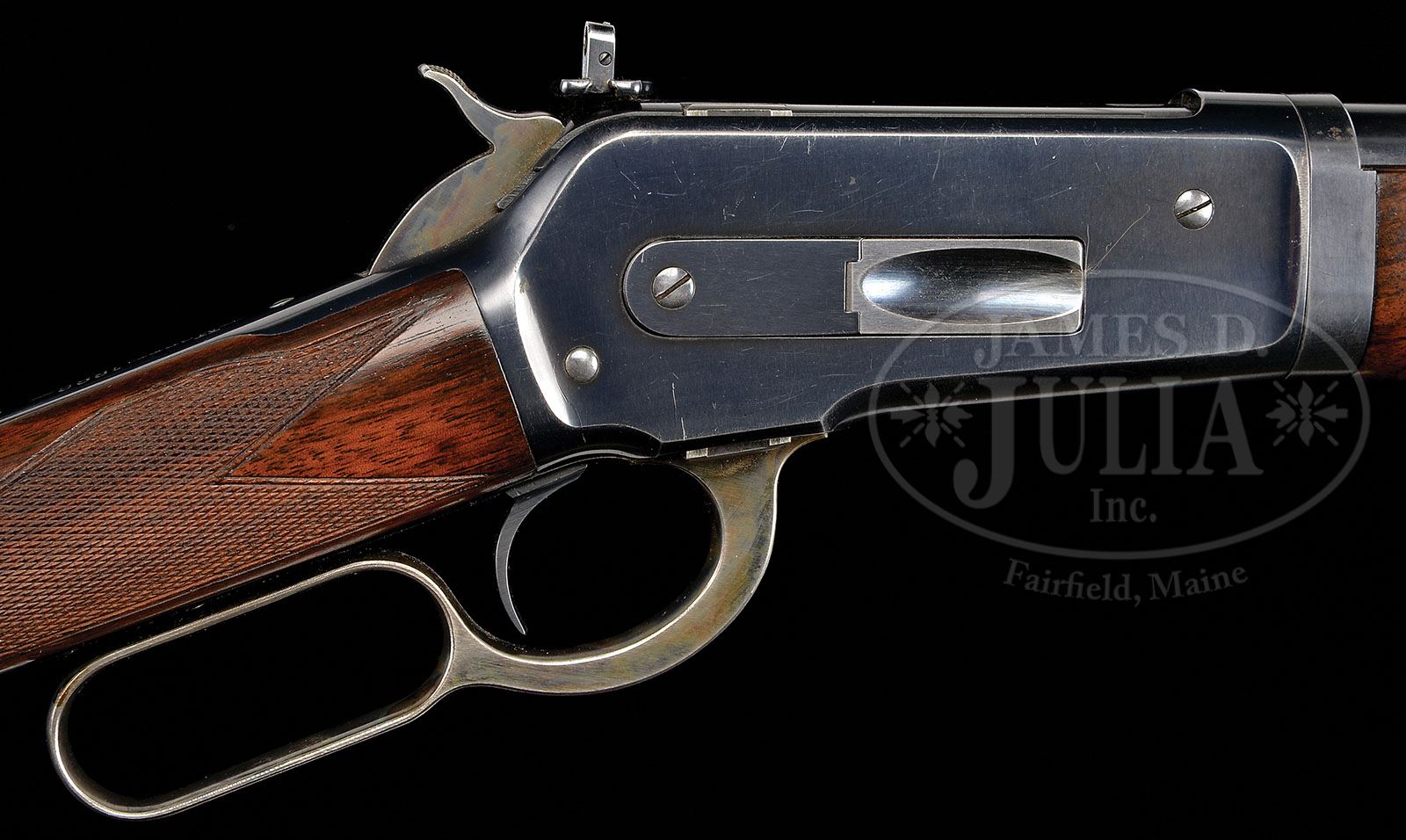 *SCARCE SPECIAL ORDER DELUXE WINCHESTER MODEL 1886 LIGHTWEIGHT TAKEDOWN LEVER ACTION RIFLE. SN 132321. Cal. 45-70. Fine late deluxe rifle with 22″ tapered lightweight rnd bbl. Full magazine, takedown, pedestal mounted, ivory bead Lyman jack front sight, no rear seat on the bbl and receiver has a Lyman 21 combination sight. Mounted with extra finish American walnut with H-style checkered forearm and straight stock with a white line waffle recoil pad. Left side of lower tang, under the wood is marked “XX” and with the assembly number “486”, matching assembly number is found in top tang channel of buttstock. This rifle is obviously special ordered with the unusual configuration of extra light bbl, no rear seat & full magazine. It was produced in 1904 at a time when Winchester was discouraging special orders, especially in other than standard configurations. Apparently they did not believe that the lightweight rifles were sufficiently accurate with the heavier cartridges and therefore had notified their dealers to discourage such orders. PROVENANCE: Woody Frey Collection. CONDITION: Very fine. Bbl, magazine tube & forend cap retain most of their strong orig factory blue with a couple of very minor nicks & some light wear on magazine tube from takedown. Takedown ring retains most of its orig finish, slightly thinned. Receiver retains 96-97% glossy orig blue with light edge wear and a few minor nicks. Lever & hammer retain strong case colors, fading to silver on the outer faces. Wood is sound and retains about all of restored finish with freshened checkering. Unfortunately stock is cut to 12-1/2″ with the 1″ pad returns it to 13-1/2″. Mechanics are crisp, brilliant shiny bore. May have been fired, but if so very little. 4-48445 JR178 (7,500-12,500)