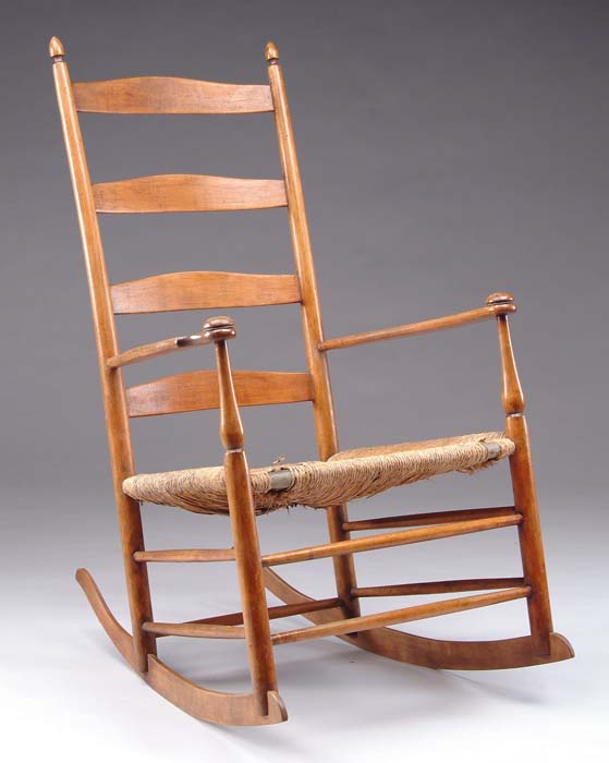 SHAKER NO. 6 LADDER BACK ROCKER. Natural finish rocker having shaped arms, rush seat, double-box stretcher, four slats with top branded “6”. SIZE: 41” h. Seat: 17” h. CONDITION: Professionally replaced rockers, seat with wear, otherwise very good. 9-72630 (300-500)