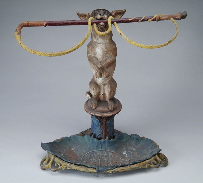 OUTSTANDING PAINTED CAST IRON UMBRELLA/CANE STAND. The figural form of a standing dog holding a double looped whip. The dog stands on a pedestal with green leaves and a scrolled base holds a separate cast iron leaf form drip pan. An unusual and desirable form. PROVENANCE: Estate of Maria M. Viveiros, New Bedford, Massachusetts. SIZE: 24” h x 24” w x 12” d. CONDITION: Some wear to paint, otherwise very good. 9-28814 (400-800)