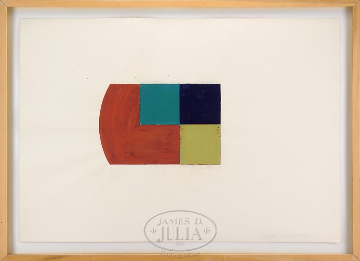 JOHNNIE ROSS (American, last quarter of the 20th Century) “RED MAIDE”. Modern abstract shows a rounded edge rectangle in colors of red, green, blue and mustard. Signed bottom right “Johnnie Ross “Red Maide” 1979 ME”. The green, blue and mustard squares appear to be applied pieces on the paper. Housed in a shadowbox type frame with glass front. Johnnie Ross was a teacher at the Portland School of Art. SIZE: Actual: 27-1/2″ x 39-1/4″. PROVENANCE: From a fine Portland, Maine home. CONDITION: Good. 9-96538 (500-1,000)