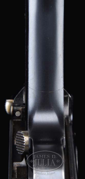 *WELL-DOCUMENTED 1906 BULGARIAN 7-SHOT “GL” MARKED BABY LUGER. SN 55076B. Cal. 30 Luger. Extremely rare Luger & possibly the only one known, with 3-1/4″ bbl, DWM scroll on toggle link and Bulgarian crest above chamber. It has “GL” (Georg Luger’s initials) at back of rear toggle link. This is a “B” range prototype serial number. This orig magazine was manufactured for seven shots and is not a cut-down longer magazine. Grip straps have been cut and welded to shorten the frame and orig matching numbered grips have been cut and spliced to fit. This Luger is so important that it was featured on the cover and on four pages (58 through 61) of Luger: The Multi-National Pistol, Kenyon. It is believed to have been made by George Luger as a gift in connection with the Bulgarian Luger contracts. Of the three original 7-shots that are known this is the finest. This rare and spectacular Luger would be an important addition to any collection. PROVENANCE: Doug Smith Collection. CONDITION: Fantastic, all orig condition, all numbered parts are matching. Overall retains about 97% orig blue & about 85% orig straw colors. Grips are very fine to extremely fine with light wear & a few nicks in the checkering but no cracks or chips and shows a beautiful wood grain. Magazine is extremely fine. Mechanics are crisp, bright shiny bore. 4-36109 JR177 & BS (75,000-125,000)
