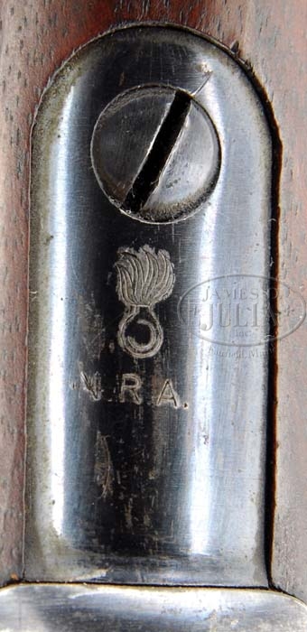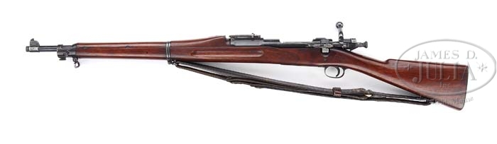 *RARE SPRINGFIELD NRA MODEL 1903 BOLT ACTION RIFLE. SN 620908. Cal. 30-06. Usual configuration with 24″ bbl dated “12-15” with standard front & rear sights and normal Springfield receiver markings. Mounted in a nicely figured 1-pc walnut stock with grasping grooves and straight grip with “P” proof and checkered steel buttplate with trap. Left side of wrist has a “J.S.A.” cartouche in a rectangle. Front band/bayonet lug has a stacking swivel with a sling loop on the grooved lower band and a corresponding sling loop on the buttstock. Trigger guard extension, in front of the floorplate, is stamped with a Springfield flaming bomb and tiny “N.R.A.” markings. Accompanied by an orig brown leather & brass military sling. Beginning in August 1916 an act of Congress authorized the President to appoint a Director of Civilian Marksmanship (DCM) for the promotion of Civilian rifle practice. Under this program existing stocks of surplus or obsolete arms & ammunition were sold to individual members of the NRA and to civilian rifle clubs. A few 1903 rifles, marked as this one, were sold through the NRA prior to WWI. CONDITION: This rifle shows near excellent overall with the receiver retaining better than 98% of its orig mottled blue finish with just a couple of very light scuffs. Bbl shows better than 98% of its orig blue with just some slight thinning at muzzle, with a bright shiny bore. The front sight of this rifle shows approx. 70% bright orig blue with the wear being from the installation and removal of a sight cover that is no longer present. The front bbl band/bayonet lug assembly shows overall approx. 95% of orig finish with one scratch on left hand side that is approx. 1″ long. Middle bbl band assembly also shows better than 95% orig bright blue with one very light scratch on right upper side and some very slight oxidation down by the screw. Floorplate & NRA marked trigger guard assembly show approx. 92-95% of orig blue with some light scratches on bottom of trigger guard & some very small spots of light oxidation on floorplate. The high hump upper handguard assembly shows very good with some light scuffing and one extremely small nick on left side of sight groove. The sgl bolt stock assembly shows very good plus overall with just some light scuffing present that doesn’t even penetrate the finish. Finger grooves & “JSA” cartouche show nearly as sharp as they were the day it was manufactured. The buttplate assembly shows better than 90% orig finish with some light edge wear from being in a rack. Sling shows good overall with some drying & cracking. Overall this is a very fine example of a 1915 NRA Springfield. 4-38824 BEK (3,500-5,500)