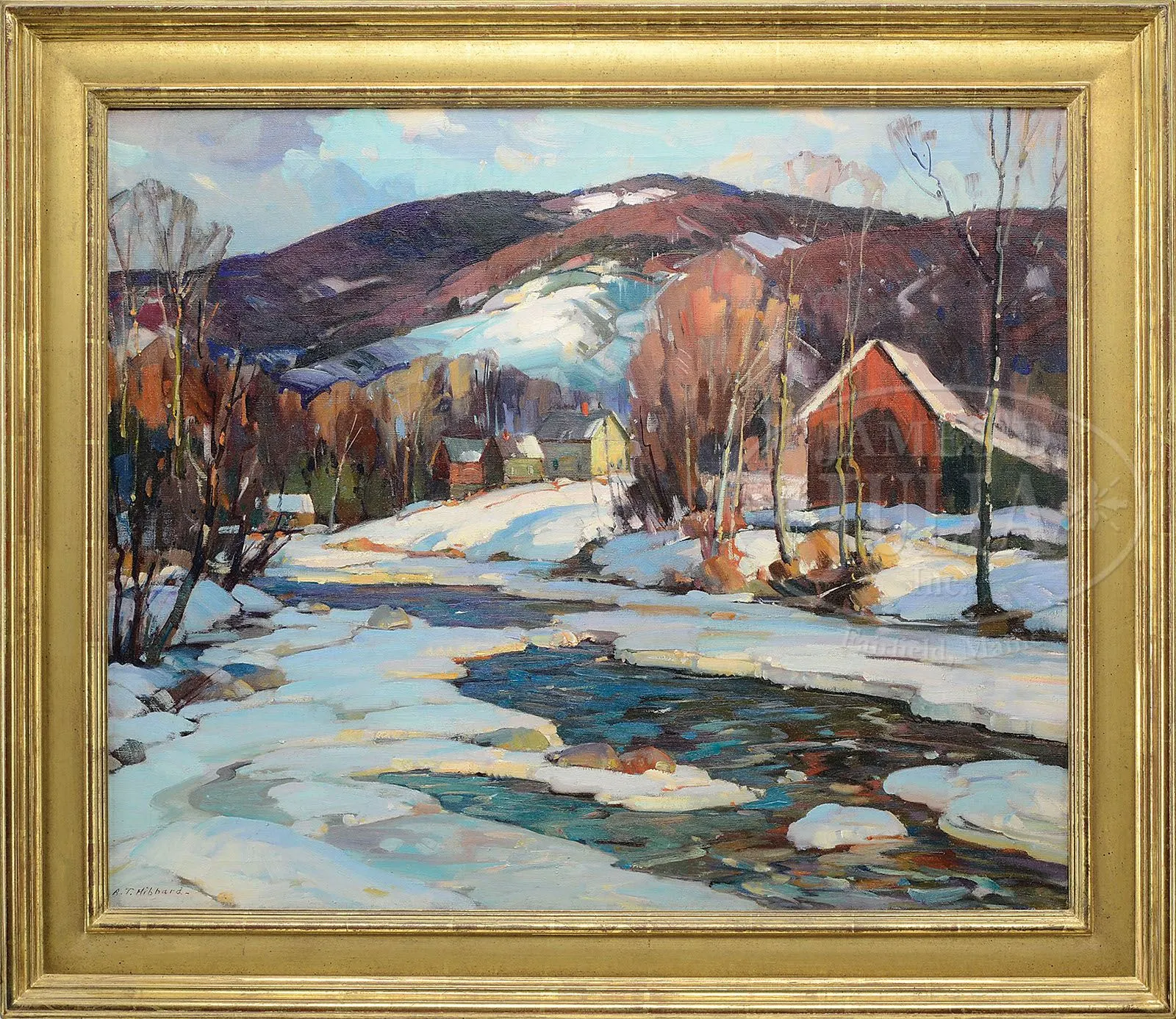 ALDRO THOMPSON HIBBARD (American, 1886-1972) SPRING THAW/ A SUNLIT VERMONT SCENE. Oil on canvas Housed in a gold Guido frame, in good condition Signed “A.T. Hibbard”, lower left SIZE: 25″ x 30″. Overall: 31-1/2″ x 36-1/4″ PROVENANCE: The John F. Gale Collection, Cambridge, MA CONDITION: Very good 9-27324 (8,000-12,000)