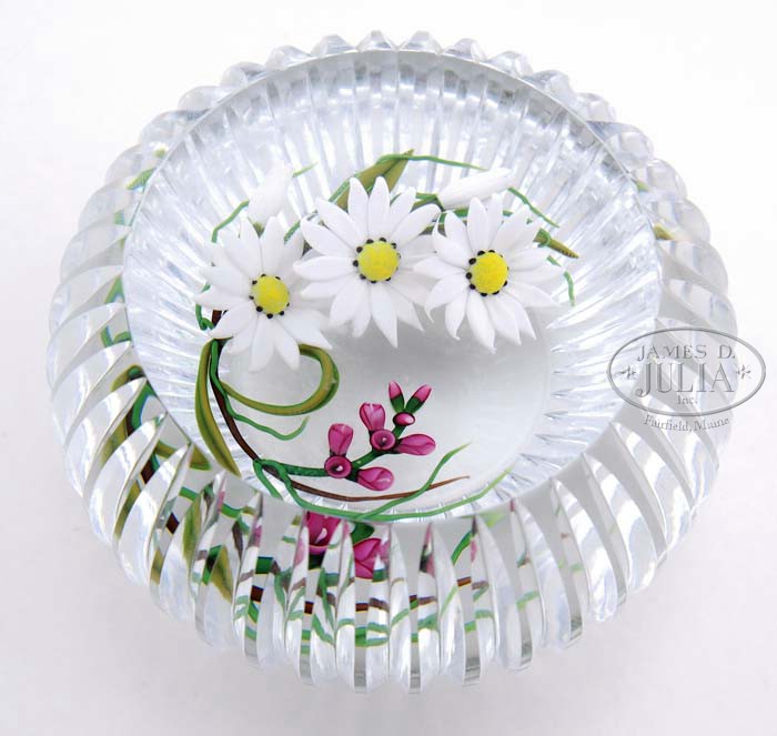 CHRIS BUZZINI “WHITE-RAYED WYETHIA” PAPERWEIGHT. Floral wreath bouquet consists of white and yellow daisies and purple flower blossoms with green leaves and stems. The side has all over faceted flutes with one large top facet. Signed on underside “Buzzini 92” and “From a Limited Edition 16/25”. SIZE: 3″ dia. CONDITION: Very good to excellent. 5-69742 (1,000-1,500)