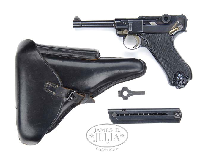 *FINE KRIEGHOFF POST-WAR LUGER & HOLSTER. SN 116. Cal. 9 mm. Beautiful post-war Krieghoff with 4″ bbl. Krieghoff Suhl logo on front toggle link with “HK” straddling the Krieghoff anchor. It has 3-digit serial number on frame & receiver & last two digits of serial number on reverse side of sideplate. Right side of receiver has large & small Kreighoff eagle proofs with a crown/”08″ mark on extractor which appears to be recycled from another pistol. Most parts are unnumbered, all being orig. It has orig full checkered black plastic grips & two correct orig “fxo” black plastic base magazines that have matching 3-digit serial numbers electric pencil etched on spine. Accompanied by an unmarked orig black leather Luger holster that has a “+” marked takedown tool. A very rare Krieghoff that is extremely difficult to find with two matching magazines and in fine orig condition. PROVENANCE: Doug Smith Collection CONDITION: Extraordinarily fine. Retains about 98-99% strong orig factory blue & 96-98% orig straw colors with ejector a brownish color. Grips are sharp & crisp showing little or no wear. Magazines and tool are extremely fine. Mechanics are crisp, brilliant shiny bore. Holster is very fine to extremely fine with minor wear. 4-36129 JR202 & BS (12,500-17,500)