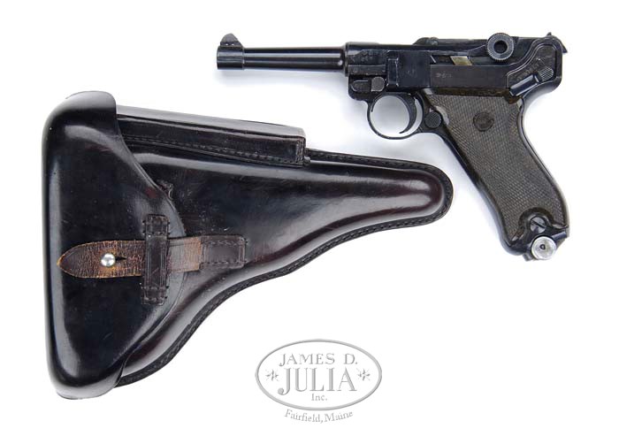 *RARE POST WAR KRIEGHOFF LUGER WITH HOLSTER. SN n1047.. Cal. 9 mm. Rare Krieghoff Luger with 4″ bbl, crown “N” proof on front toggle link & crown “U” (Vopo era Krieghoff proof) on frame & receiver. Most parts have matching numbers, including the renumbered magazine. Some parts are unnumbered or have numbers that have been XXed out. All parts are correct for this pistol including Vopo plastic grips. Accompanied by a black leather post-war police style Luger holster. This pistol was made in the early 1950’s when Krieghoff tooled up to make Lugers but very few were manufactured. The finish is fairly crude with many visible tool marks. This is one of the most rare of the post-war Krieghoffs. PROVENANCE: Doug Smith Collection CONDITION: Exceptionally fine. Overall retains 99%+ strong orig factory blue. Grips are extremely fine & magazine is near mint. Crisp mechanics, brilliant shiny bore. Holster is extremely fine with minor scuffs & some crackling on strap. 4-36143 JR213 & BS (4,000-6,000)