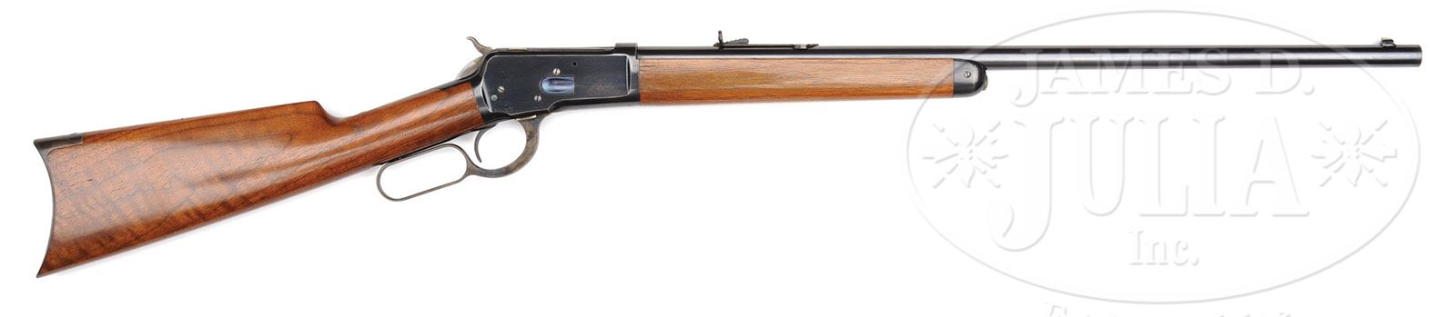 SCARCE SPECIAL ORDER ANTIQUE 1ST YEAR OF PRODUCTION WINCHESTER MODEL 1892 LEVER ACTION RIFLE. SN 21098. Cal. 38 WCF (38-40). Standard grade rifle with 24-1/4″ rnd bbl, half magazine, half nickel front sight & semi-buckhorn rear sight. Mounted with very highly figured, uncheckered, slab sawed American walnut with straight stock & crescent buttplate. This rifle was produced in a time when the west was still a little wild and the only mode of transportation was horseback, wagon or buggy which exposed any firearm to extremes of weather and conditions, usually with little or no maintenance. These light rifles were simple working tools that usually teamed up with Colt revolvers using identical cartridges. It is most unusual to find one of these rifles with high orig finish. PROVENANCE: Woody Frey Collection. CONDITION: Extremely fine plus, crisp and orig with bbl & forend cap retaining nearly all of their crisp, orig factory finish showing only faint muzzle end wear. Receiver retains 96-97% crisp, orig factory finish with a couple small flaked areas on each side and slight wear on the top rear edges, with faint sharp edge wear. Lever, hammer & magazine plug retain virtually all of their crisp, brilliant orig case colors. Buttplate retains virtually all of its orig case colors, lightly to moderately faded. Wood is exceptionally fine with a few very light scratches on the left side of buttstock, a couple of small nicks on the right side and overall retains virtually all of its crisp, orig bright factory finish. Mechanics are crisp, brilliant shiny bore. Appears to be new & unfired. 4-48458 JR227 (8,000-12,000)