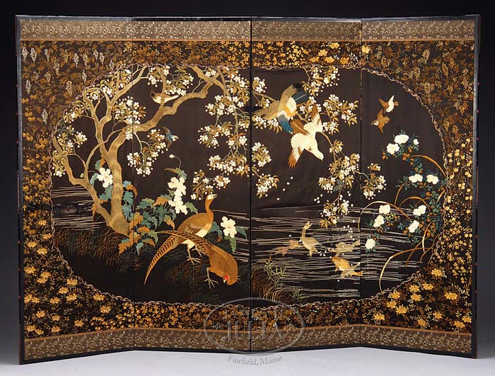 CHINESE SILK EMBROIDERED DRESSING SCREEN. Mid-19th century. The four-panel screen intricately woven with pairs of exotic birds flying amongst flowering branches above a fanciful pond, beneath which one sees aquatic plants and koi fish, bordered within a scrolling cartouche of silver thread and further bordered by spandrels of wisteria, peonies, ferns, and anemones, all on coffee-colored ground. The reverse covered in textured paper. SIZE: 62-1/2″ h. x 23″ w. (each panel). PROVENANCE: From a fine Beacon Hill and Thomaston estate. CONDITION: Colors remain soft and rich with developing weaknesses in the silk threading of the water surface and some of the flowers in the area of the koi. The silk foundation has lateral tears in the first and third panels, just below the midpoint. Another small tear in the third panel foundation beneath the borders. Wonderful screen worthy of restoration. 9-93580 (1,500-2,500)