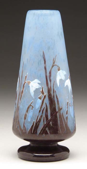 DAUM PADDED & WHEEL CARVED VASE. This wonderful Daum vase has acid carved leaves and stems in mottled brown glass against a beautiful mottled blue background. Stems are finished with beautiful padded blue and white snow flowers and buds which are very nicely wheel carved. Signed on the edge of the foot with carved “Daum Nancy”. SIZE: 9-1/2” t. CONDITION: Very good to excellent. 5-63981 (3,000-5,000)