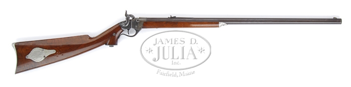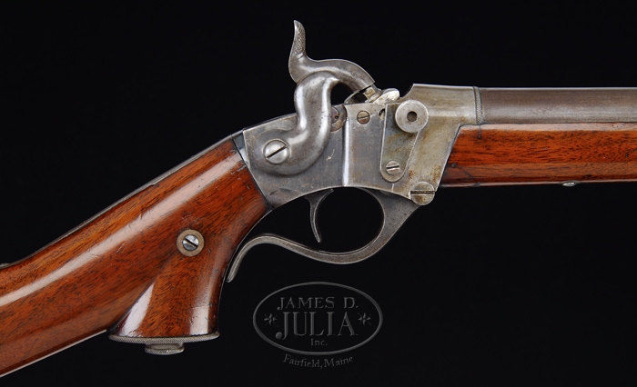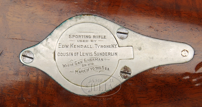 RARE SHARPS CONVERSION PISTOL RIFLE. SN 868. Cal. 38 RF. Appears to be a transition model with 25-1/4″ rnd bbl, dovetail Rocky Mtn. German silver front sight and a small adjustable open rear sight which is numbered to the rifle. It has the early German silver buttplate, patch box & forend cap with the “C. SHARPS / PATENT / 1848-52” markings on receiver but is without the ramrod fittings. Mounted with very nicely figured, uncheckered American walnut with long slim forearm and pistol grip stock with steel oval grip cap and perch belly butt. Right side of butt stock has a patch box which is engraved in block letters on lid “SPORTING RIFLE / USED BY / EDW. KENDALL. TYRONE. N.Y. / COUSIN OF LEWIS SUNDERLIN / WITH GEN. SHERMAN / ON HIS / MARCH TO THE SEA”. Receiver & breech block have been altered by having primer feed mechanism filed away to match the opposite side contour and a manual extractor attached to right side which operates in a small slot milled into receiver. Breech block has had the nipple replaced with a firing pin and the hammer nose has been plugged to present a flush surface. It should be noted that his item is from ex-Norm Flayderman Colleciton and copies of service records are included, along with a note from Mr. Flayderman. PROVENANCE: ex Norm Flayderman Colleciton. CONDITION: Fine. Bbl retains 75-80% plum/brown finish and receiver strong case colors, primarily on right side, with traces on left side and balance faded to gray. Wood is sound with light scratches & dings and a series of bruises by patchbox and retains most of its orig varnish. Hammer has a hairline crack in the shank and will not always hold at full cock, otherwise mechanics are fine, strong bright bore with a few spots of scattered light pitting. 4-31905 JR166 (5,000-10,000)