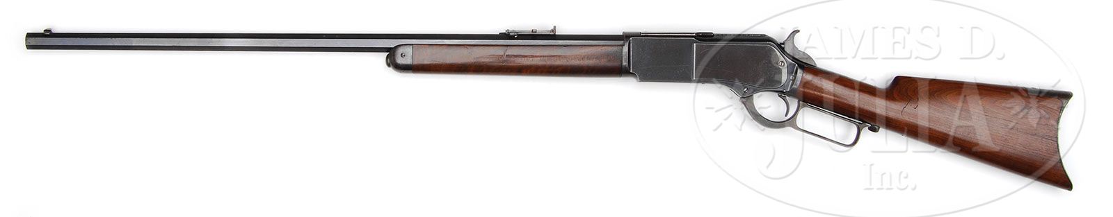 WINCHESTER MODEL 1876 SPECIAL ORDER LEVER ACTION RIFLE. SN 60639. Cal. 45-75. Standard grade rifle with 28″ oct bbl, button magazine, half nickel front sight and “1876” marked ladder rear sight. It has extra finish, beautifully grained, American walnut stock & forearm, uncheckered with straight grip & crescent butt with trap. Accompanied by a Cody Firearms Museum letter identifying this rifle, as found, shipped on February 11, 1891. PROVENANCE: Wes Adams Estate Collection. CONDITION: Very fine to extremely fine. Bbl retains 97-98% strong, bright, orig blue with some very fine spotting over the forearm area and a couple of small dings on left top flat and another on the bottom flat. The receiver retains 94-96% strong, bright, orig blue with some light surface flaking and pin pricks of light rust along with some light candy striping and a scratch on left side with some light scratches on the right side plate. The lever retains 60-70% dark orig case colors, bright in the sheltered areas, and the hammer about 95% bright colors. Wood is sound with a tiny chip near the top tang and a few small handling & use marks and retains about all of its orig factory finish. Mechanics are crisp, brilliant shiny bore. 4-44544 JR38 (10,000-15,000)