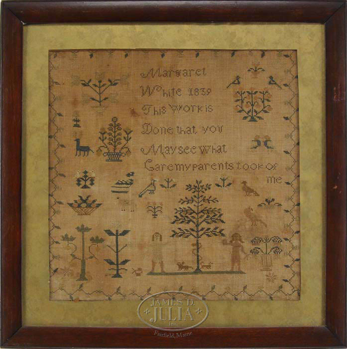 ANTIQUE PICTORIAL ADAM & EVE SAMPLER BY MARGARET WHITE 1839. Needlework having a vine border encompassing a verse “This work is done that you may see what care my parents took of me”. Above which is “Margaret White 1839”. Below which is Adam & Eve flanking a tree with a snake. Other pictures include pot of flowers, basket of flowers, deer, birds, other animals, lovebirds, etc. Housed in a mahogany wood frame with gold liner. SIGHT SIZE: 16” x 16”. CONDITION: Brown tone throughout. Generally good. 9-73325 (1,000-2,000)