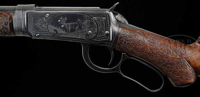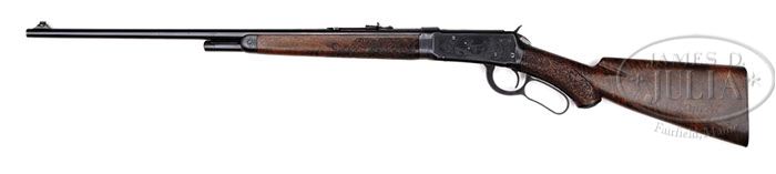 *EXTREMELY RARE FACTORY ENGRAVED WINCHESTER MODEL 55 TAKEDOWN DELUXE LEVER ACTION RIFLE. SN 1817. Cal. 30 WCF (30-30). Extremely rare rifle, with only a few known and this may be the only one of its configuration. Rifle has a 24-1/4″ lightweight tapered rnd bbl, half magazine, takedown with gold bead pedestal front sight and semi-buckhorn rear sight. Bbl has usual Model 55 markings with “nickel steel”. Receiver is factory engraved, probably by Stokes, in a slightly modified #2 pattern consisting of a standing whitetail buck & doe in a mountain meadow on the left side and a walking bull moose on right side. Mounted with highly figured, about 2X, American walnut with B-carved forearm and capped pistol grip stock with serrated steel buttplate. Left side of receiver is factory drilled & tapped for a receiver sight. This exact rifle is pictured on p. 290 of Winchester Engraving, Wilson (second edition) with credit to the Felix A. Bedlan Collection. It is pictured, both sides, in full color. PROVENANCE: Wes Adams Estate Collection; Felix A. Bedlan Collection CONDITION: Very fine. Bbl, magazine tube & forend cap retain about all of their strong, bright orig blue with only slight muzzle edge wear. Receiver & takedown ring also retain most of their strong orig blue with some slight thinning on the bottom of the takedown ring and front edge of the receiver. Front end of the floorplate is a silver/brown patina. There is a short hairline back of the top tang, otherwise wood is sound with a few very light handling & storage mars and retains most of its orig factory oil finish. Mechanics are fine, brilliant shiny bore. 4-44349 JR7 (10,000-15,000)