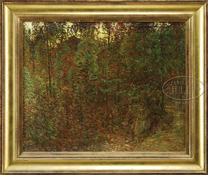 JOHN JOSEPH ENNEKING (American, 1841-1916) “GREEN TWILIGHT”. Oil on canvas landscape scene shows a wooded area with light at top of trees and foreground with grass leading to rocks. The scene is behind the artist’s house in Hyde Park. Unsigned but on reverse of stretcher is title and Vose Gallery inventory numbers. From a small group of paintings which have been categorized as “mood paintings” by the artist and were mostly done for the artist and not for public sale. Housed in a fine gilt replacement frame stamped “Guido Frame Studio, Boston”. SIZE: 24″ x 30″. CONDITION: Relined. Very good. Some small areas of inpainting. The original canvas, which went over a 22″ x 30″ stretcher has been re-stretched on a 24″ x 30″ stretcher. 9-98425 (5,000-10,000)