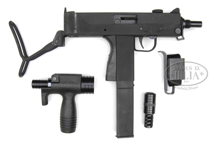 **SWD INC. M-11/9 mm SUBMACHINE GUN (Fully Transferable). SN 85-0007403. Cal 9mm. Open bolt select fire smg. Black Parkerized finish, collapsible top folding stock, fixed rear peep sight, front protected post sight. Appears to be as new in box (if not new)except for some light storage marks on right rear of receiver and showing evidence of light firing or possibly test firing. Includes factory box, front hand strap, magazine loader, one magazine and cleaning rod. Also includes new front “K” grip/bbl extension and spare muzzle break/flash hider. CONDITION: Little to no wear on finish or action to signify any firing other than test firing. 4-44933 JZ15 (2,000-3,000)