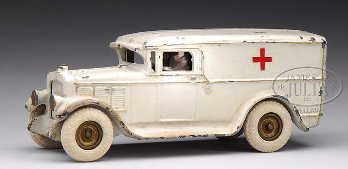 EXTREMELY RARE ARCADE WHITE AMBULANCE. One of two ambulances from the golden era of automotive toys (1930s) that was undoubtedly produced as a prototype for possible production. Although Arcade produced a smaller ambulance (approx. 6″) and Kenton produced a larger ambulance from the 1910s, there are no other larger ambulances produced by any toy company from this era. The White panel truck is normally painted in a lighter green, as was the case here, but the toy has been overpainted at the factory in a white color with a red cross. Perhaps the decision was made after viewing this toy not to produce for commercial use. It is believed to be one of two known. SIZE: 8-3/4″ l. PROVENANCE: From the collection of the late Larry Seiber of San Jose, CA. CONDITION: Overall very good, as typical there is some fine crazing to white paint. 1-9071 (4,000-6,000) Auction: Advertising, Toy & Doll - Spring 2009 Please Note: All prices include the hammer price plus the buyer’s premium, which is paid by the buyer as part of the purchase price. The prices noted here after the auction are considered unofficial and do not become official until after the 46th day. |