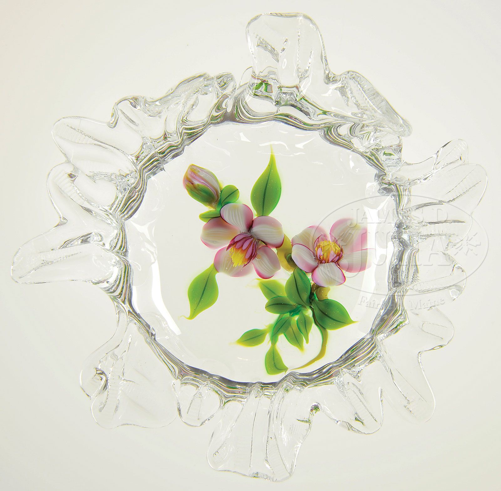 DEBBIE TARSITANO SPLASH PAPERWEIGHT. Internal decoration consists of two pink and white blossoms with one bud, green leaves and stem encased in clear crystal with pulled out water splashes. Signed on underside with a “DT” signature cane. Included is a catalog entitled “Winter Garden: The Tarsitano Paperweights Trompe L’Oeil In Glass” Alexander Gallery New York. The catalog is autographed on the front “Debbie Tarsitano 1994”. SIZE: 5″ dia at widest x 2-3/4″ t. CONDITION: Very good to excellent. 5-65515 (700-900)