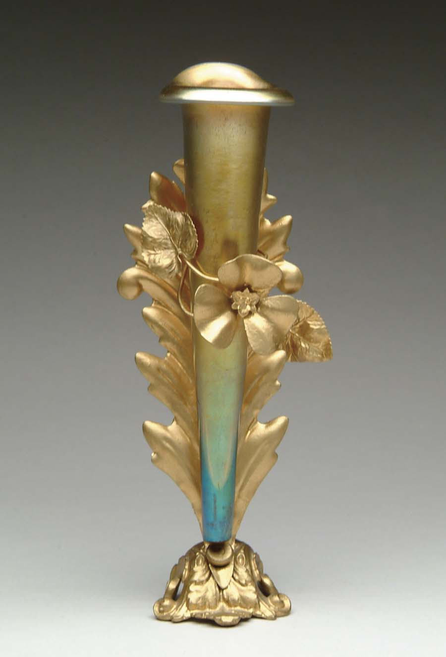 TIFFANY VASE. Lovely Tiffany vase has iridescent gold finish with bright blue highlights at the bottom. Vase is signed on the bottom “LCT” and rests in a gold painted metal floral frame. Frame is not original to this vase. SIZE: 9-1/2 in. t. CONDITION: Very good to excellent. Collection of Dr. C. & Margaret Chastain 5-61392 (200-400)