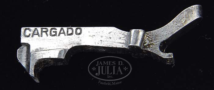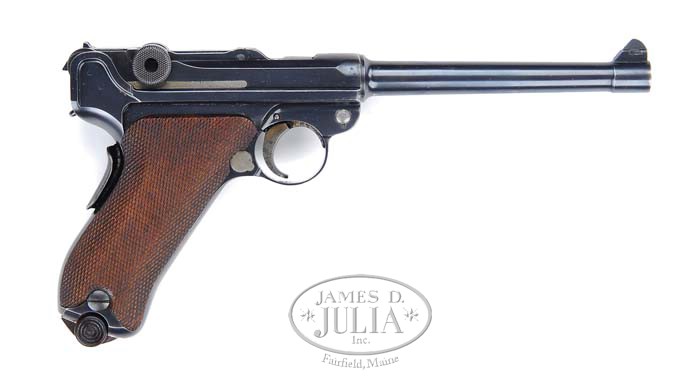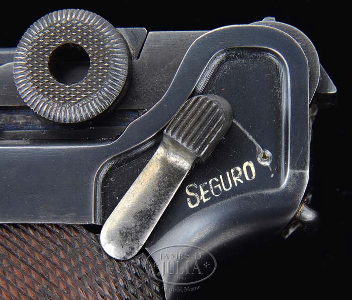 *ULTRA-RARE 1906 DWM ARGENTINIAN NAVY LUGER. SN 25929. Cal. 9 mm. Extraordinarily rare Luger with 6″ bbl, long frame, DWM scroll on front toggle link, and Argentinian crest over chamber. The extractor is marked “CARGADO” and safe position is marked “SEGURO”. It has commercial “BUG” proofs on bbl & “BU” proofs on receiver, breech block & front toggle link and has a grip safety. Mounted with full checkered walnut grips & accompanied by an unnumbered commercial Navy magazine with concentric rings on wooden base. An extremely rare Luger, this is one of only 2 genuine ones known to exist by Mr. Smith. PROVENANCE: Doug Smith Collection. CONDITION: Very fine to extremely fine. Overall retains about 95% orig blue & about 40% orig straw colors. Majority of wear is at muzzle edge & sharp edges with a wear spot over chamber area & some thinning of sideplate. Grip safety is a blue/gray patina. Grips are clean & sharp showing light wear with a few scattered chipped diamonds & still shows good wood grain. Magazine is extremely fine with one minor chip. Mechanics are crisp, bright shiny bore with a few spots of minor frosting. An extremely rare pistol & probably the only one to ever come to market. 4-36121 JR185 & BS (30,000-50,000)