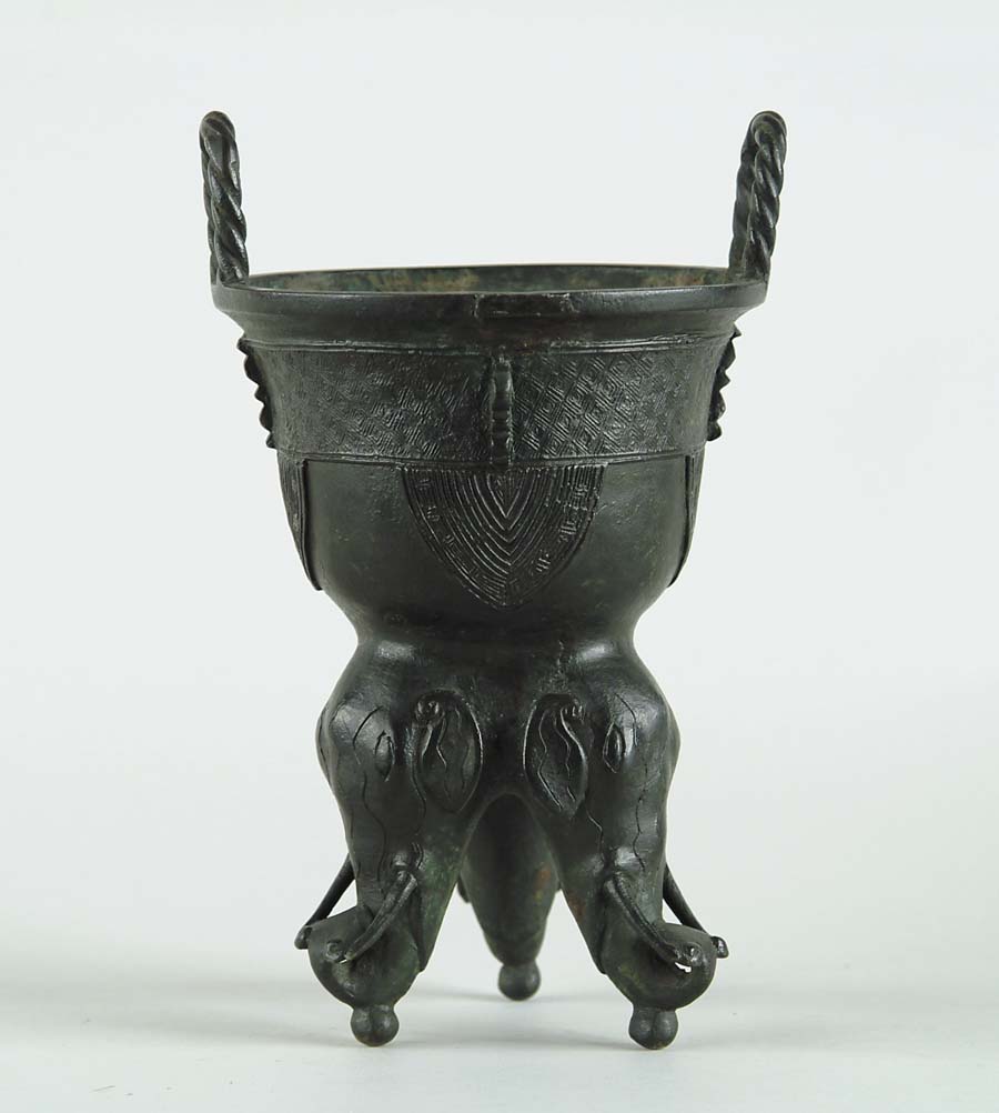 ORIENTAL BRONZE TRIPOD CENSER. High loop rope twist style handles, body cast in kettle form resting on three elephant head legs ending in small button feet. Interior marked with 2 vertical columns of characters. SIZE: 10-1/2” h x 6-1/4” dia of top. CONDITION: One repair to rim. 9-96476 (200-400)