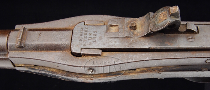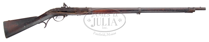TEXAS CONFEDERATE ALTERATION OF HALL RIFLE. SN NSN. Cal. 64. The following described gun was found in Texas and is a most unusual alteration to percussion. Mr. Michel, in his notes, describes this gun as follows: “Alteration to percussion of Model 1819 Hall rifle. Breechblock marked ‘J. H. Hall / H. Ferry / U. S. / 1831’. This alteration performed by a striker inserted between the jaws of the hammer with a percussion nipple screwed into the former pan. This example was recovered in Texas and shows the effect, not uncommon, of a blowout resulting from loose powder being ignited inside the breech. Wood on the right side has been completely blown away alongside the breech and striker. Top jaw and jaw screw of hammer shorn off”. Similar examples are described, but not shown, in Murphy & Madaus. CONDITION: Gun appears in as-found condition. All metal parts are brown and pitted. Stock exhibits several breaks and missing approx. 11″ section on right side as described above allowing mechanism to be shown. Gun lacks ramrod and top jaw and striker to nipple. 4-31283 JS150 (2,000-4,000)
