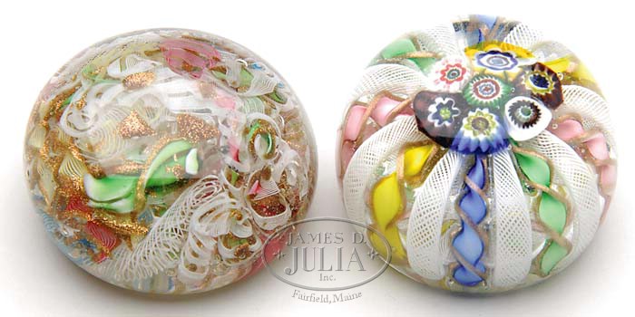 TWO MURANO PAPERWEIGHTS. 1) Crown paperweight with twists of blue, green, pink and yellow having aventurine edges with a central millefiori cane cluster. 2) Scramble with twists of white, pink, yellow and blue filigree and gold aventurine. SIZE: 2-3/8″ dia and 2-1/2″ dia. CONDITION: Scramble has minor edge roughness, otherwise very good to excellent. 5-67374 5-67422 (100-200)