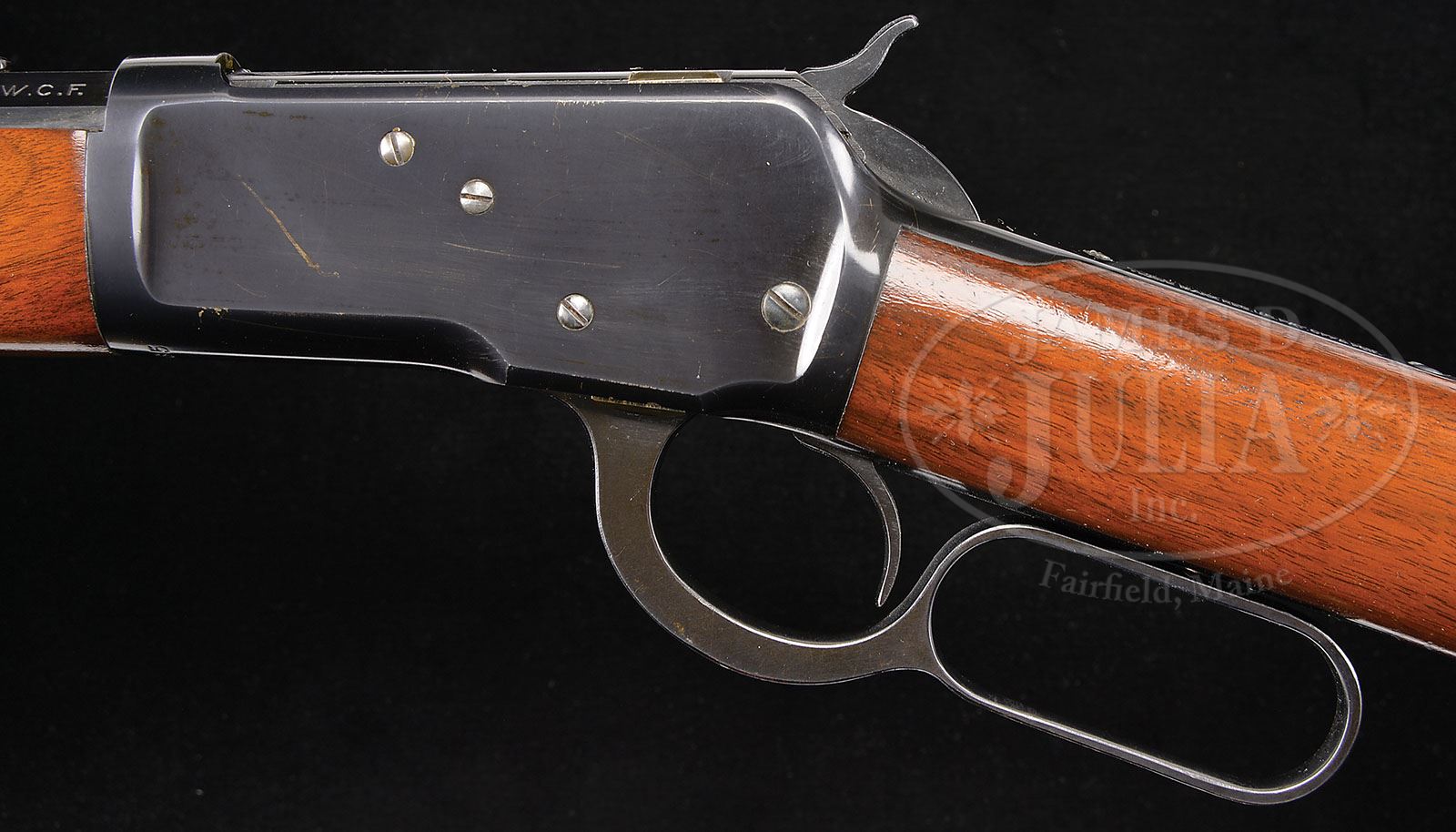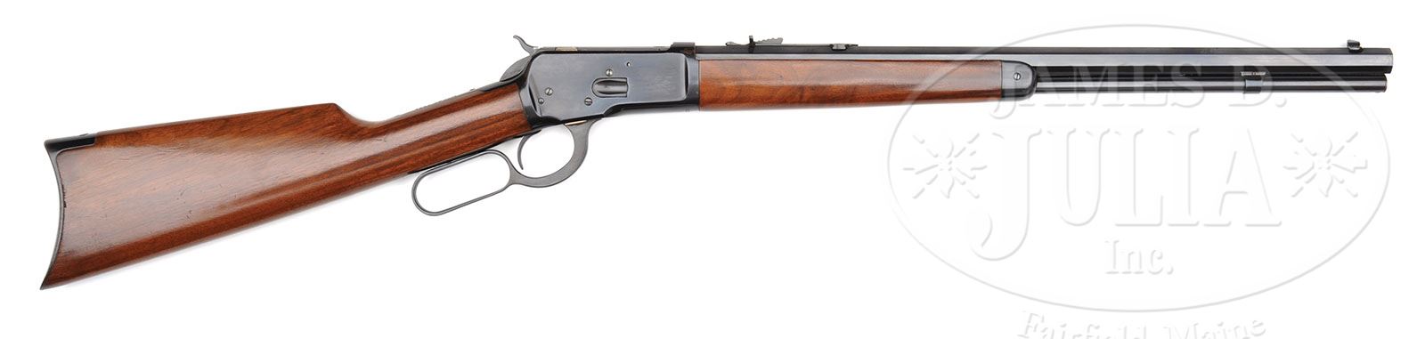 *VERY RARE WINCHESTER MODEL 1892 LEVER ACTION SHORT RIFLE. SN 858465. Cal. 32 WCF (32-20). Very rare short rifle with a 20″ oct bbl, full magazine, standard sporting front sight with screw & flat top rear sight. Mounted with uncheckered, straight grain American walnut with rifle forearm 8-3/8″ long and straight stock with crescent buttplate. While these special order short rifles were available to the general public it has been this cataloger’s experience that the majority of them were ordered and used by the movie industry. Most of the movie industry short rifles were made up from left over parts and frequently show unusual configurations, however that is not the case here. This rifle is completely orig in all ways & remains as ordered. PROVENANCE: Woody Frey Collection. CONDITION: Extremely fine plus, all orig. Bbl, magazine tube & forend cap retain 99% plus crisp, orig blue finish. Receiver, lever & hammer retain about 97-98% glossy orig blue with a scratch on left side of receiver and a small cleaned area on the right side, with one small spot of flaking on the top right. Buttplate retains about 85% crisp, orig blue, the balance having flaked to a dark patina. Buttstock has a couple of small nicks & minor mars in the surface and overall retains 99% plus crisp, orig factory finish. Mechanics are crisp, brilliant shiny bore, probably unfired. Few of these special order rifles are found today and almost never with any orig finish. 4-48452 JR221 (4,000-7,000)