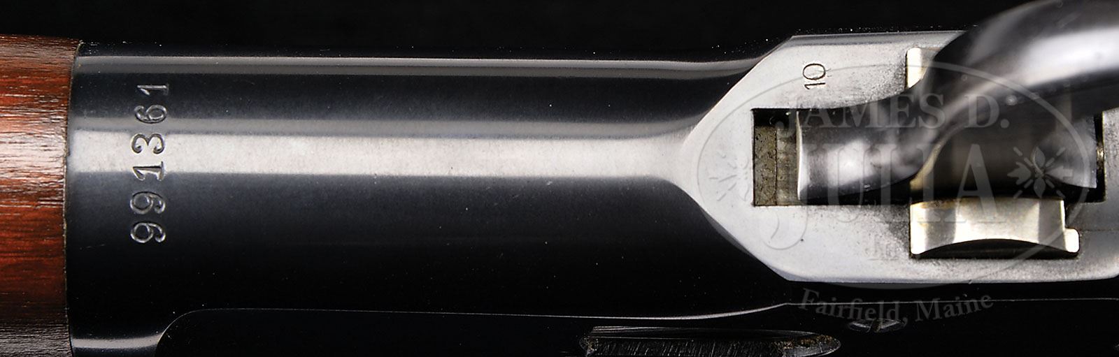 *BEAUTIFUL WINCHESTER MODEL 92 SADDLE RING CARBINE. SN 991361. Cal. 44 WCF (44-40). Standard carbine with 20″ rnd bbl, full magazine, square base front sight and 2000 yd. carbine ladder rear sight. Left side of the receiver has a staple & ring. Ring is covered with cloth. Mounted with very nicely figured, uncheckered, slab sawed American walnut with straight stock & carbine buttplate. This carbine was produced in 1928 at a time when cowboys were still prevalent in the west and a lot of people still used wagons and buggies for transportation. Most of these carbines were simply tools and are rarely found with high orig finish. PROVENANCE: Woody Frey Collection. CONDITION: Extremely fine plus, all orig. Overall retains about 99% plus crisp, orig factory finish with a couple of tiny scratches on the receiver and a couple of small nicks on the lever. Wood has one tiny nick on the bottom of the stock, otherwise appears to be flawless with all its orig finish. A truly outstanding example that appears to be new and unfired. 4-48456 JR219 (7,500-12,500)