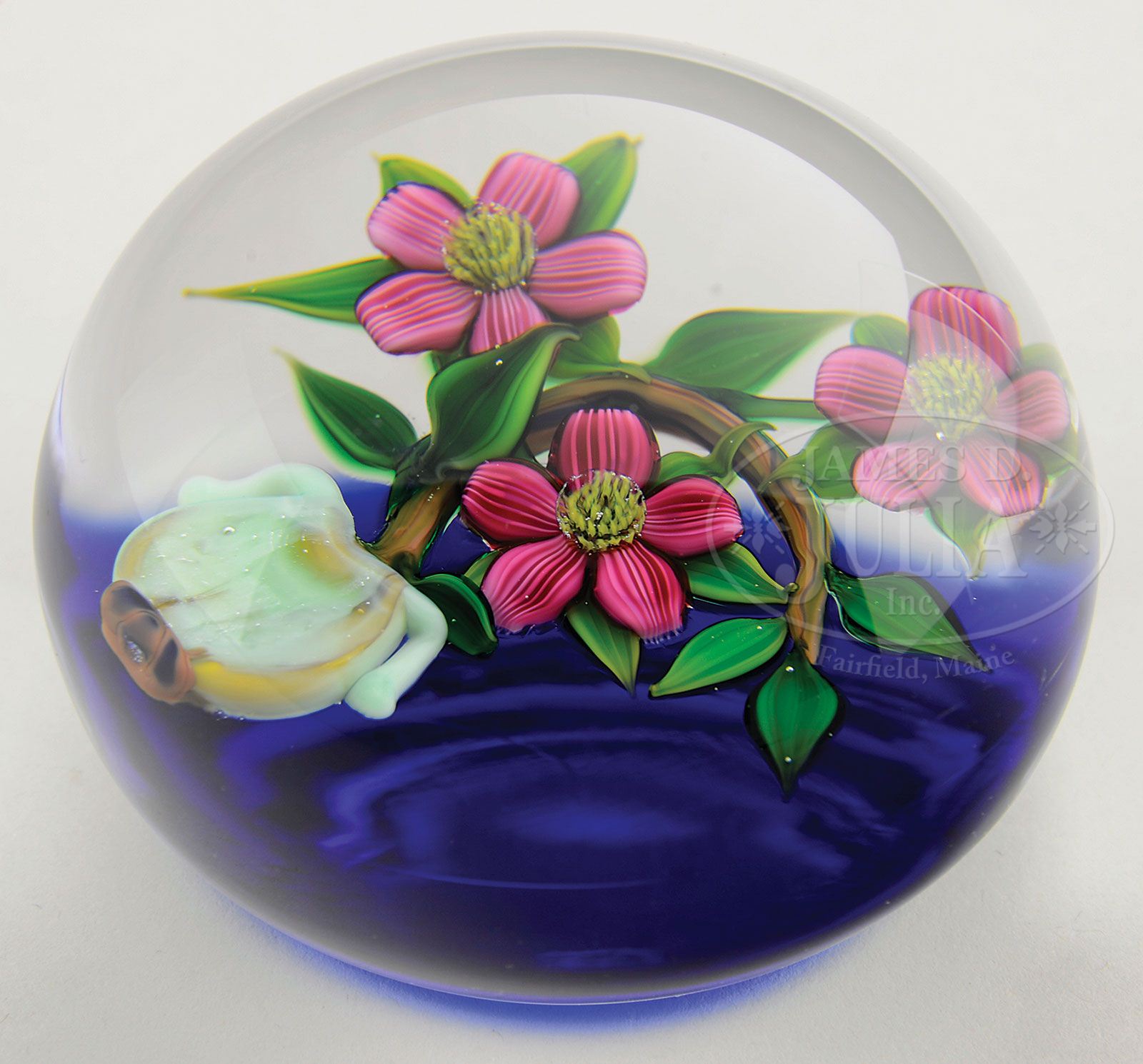 DEBBIE TARSITANO FLORAL PAPERWEIGHT. A two handled vase contains a branch with three pink flower blossoms and green leaves. Entire design rests against a cobalt blue ground and is signed on an underneath with a “DT” signature cane. SIZE: 2-3/4″ dia x 2-1/8″ t. CONDITION: Very good to excellent. 5-65419 (300-500)