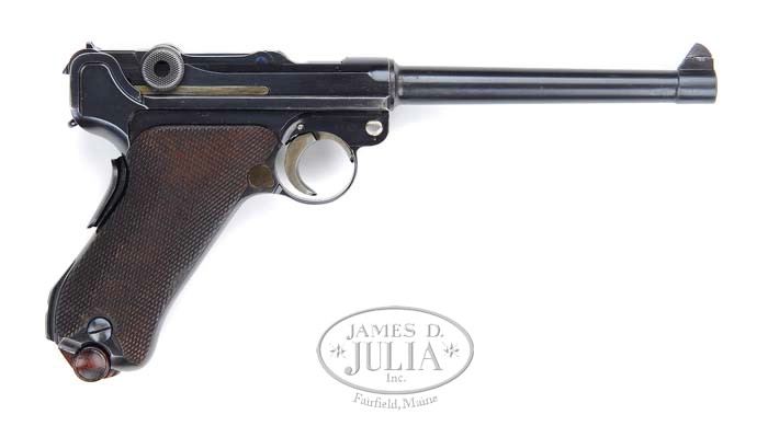 *EXTREMELY RARE DWM 1920 COMMERCIAL LUGER WITH GRIP SAFETY AND 6″ BARREL. SN 1130t. Cal. 30 Luger. Rare long bbl commercial with 6″ bbl, DWM scroll on front toggle link, crown “N” proof on left side receiver and “GERMANY” export mark on left top side of bbl. Fitted with full checkered walnut grips & accompanied by an orig “GERMANY” marked wood base magazine. Bbl is unnumbered. Thumb safety area is marked “GESICHERT” in bottom position & extractor is marked “GELADEN”. An unusual configuration that is in beautiful orig condition. PROVENANCE: Doug Smith Collection. CONDITION: Extraordinarily fine, overall retains about 98-99% strong orig factory blue & about 97-98% orig factory straw colors with some thinning on thumb safety & face of trigger. Grips are sound showing light wear with a few scattered chipped diamonds and show dark wood grain through checkering. Magazine is near mint. Mechanics are crisp, brilliant shiny bore. 4-36149 JR216 & BS (4,500-6,000)