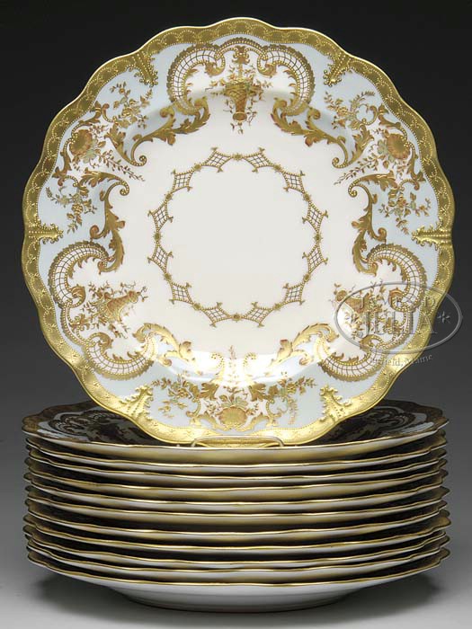 SET OF TWELVE GILT DECORATED ROYAL CROWN DERBY SERVICE PLATES. Circa 1893. Each decorated with hanging floral filled urns within C-scrolled cartouches joined by scrolling leaf tips alternating with pale turquoise reserves all on an ivory ground. With Royal Crown Derby 1893 back stamp. SIZE: 10″ dia. PROVENANCE: From the private collection of Dorothy-Lee Jones. CONDITION: In very fine condition overall. 9-23263 (1,000-2,000)