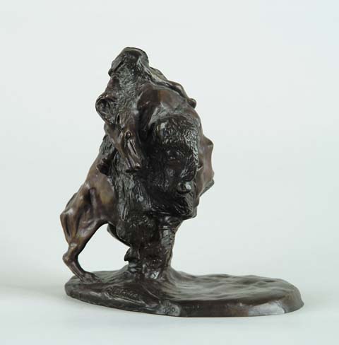 ALDERMAN (20th Century, American) BUFFALO, HORSE AND RIDER. Signed bronze “Alderman 1/100”. Figure of buffalo has horse and rider atop. SIZE: 6-3/4” h x 6” w. CONDITION: Very good. 9-96202 (100-200)