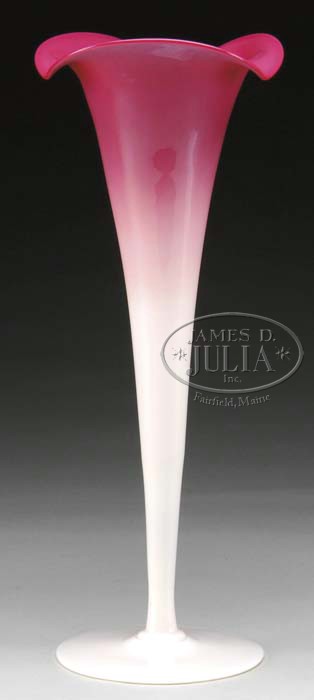 NEW ENGLAND PEACH BLOW LILY VASE. Very pretty New England Peach Blow vase has slender flaring body with wider flaring ruffled rim. Vase is done in a shiny finish. SIZE: 15″ t. CONDITION: Very good to excellent. 5-61933 (700-1,000)