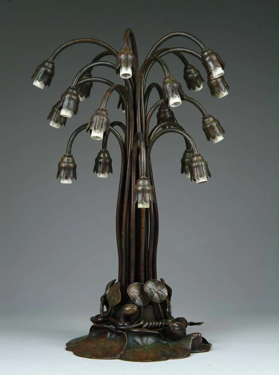REPRODUCTION 18-LITE LILY BASE. Bronze 18-lite lily base is a reproduction of Tiffany design with lily pad foot. Brown patina with green highlights. SIZE: 20 in. t. CONDITION: Some wear to patina at foot, otherwise very good. Estate of Jon Heiden & Donald Mooers 5-60664 (300-500)