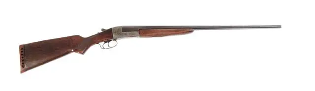*STEVENS SPRINGFIELD MODEL 5000 DOUBLE BARREL SHOTGUN. Cal. 410. Standard shotgun with 26” bbls choked FULL/FULL. Dbl triggers and extractors, straight grain walnut with semi-beavertail checkered forearm and semi-pistol grip stock 14-3/8” over an old red head pad. SN C19223. CONDITION: Fine. Bbls retain 90-92% thin original blue. Receiver 50-60% case colors. Wood is sound and retains most of an old refinish. Bright shiny bores. 4-47830 JR578 (200-400)
