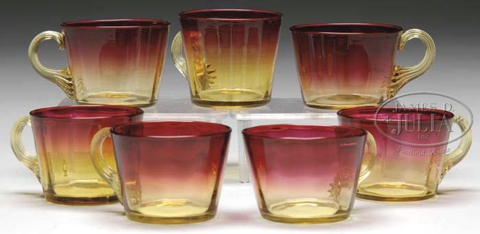 SEVEN AMBERINA PUNCH CUPS. Each cup has slightly flaring, vertical ribbed sides and is finished with an applied amber reeded handle. SIZE: 2″ t. CONDITION: Very good to excellent. 5-63275 (100-200)