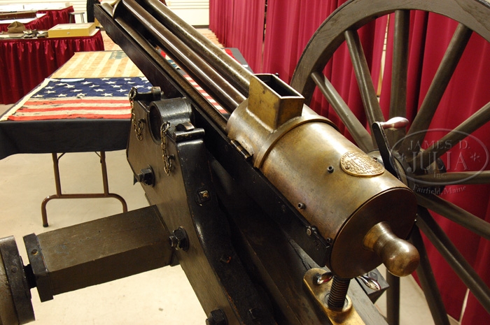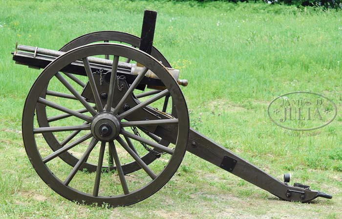 WONDERFUL REPRODUCTION OF THE RARE MODEL 1866 1″ PERCUSSION GATLING GUN ON FIELD CARRIAGE. Cal. 1″. Spectacular hand crafted reproduction 1″ percussion M1866 Gatling gun with 1871 improvements, six 43-1/2″ bbls and 3-5/8″ trunnions with brass housing. mounted on an accurately reproduced 1860’s artillery field carriage which was the same carriage as used on the orig guns. This is the only known reproduction of the now believed extinct M 1866 1″ Percussion Gatling gun. Only sixty-two of the orig 1″ Gatling guns were ever made, with sixty-one of them made in 1866 and one more in 1871. Reference The Gatling Gun Notebook, Hughes, p. 6 & 11. Six of the orig guns were made at the Miles H. Greenwood Foundry in Cincinnati, Ohio which burned down with all the blueprints & patterns destroyed. Production was moved to the Cincinnati Type Foundry Works where there were thirteen more made and then the Cooper Firearms Mfg. Co. made eight more. Later in 1866 production was transferred to Colt’s Patent Firearms Mfg. Co. in Hartford, apparently where the balance of the production was completed. Most of these were sold as military surplus to Francis Bannerman in 1902 who resold them to foreign governments and presumably they are now destroyed. Percussion Gatling guns use a separate loaded chamber with percussion musket cap on a nipple at the closed end and are fed from a stick magazine style hopper into the rotating breech mechanism which fires them in their turn and drops the empty out the bottom for re-use. This fine reproduction Gatling is accompanied by 24 machined steel chambers with an O-ring groove around the front end for gas seal. Also accompanied by two of the sheet metal stick magazine hoppers, and 2 boxes of cleaning gear & spare parts. This carriage is by J.C. Bidwell of Pittsburgh and has about 59″ diameter wheels with an approx. 78″ wide axle with standard artillery trail that is approx. 100″ from tip of trail to front of wheels. Consignor states that this Gatling gun has been fired each year at the North/South Skirmish Association Cannon Shoots and is extremely destructive to the targets, more so than the 6-pounder cannons. CONDITION: Fine and complete. Has been fired but not abused. Retains most of its orig finish. Carriage is outstanding retaining most of its orig military green paint. A remarkably well made 20th century manufacture of the model 1866 1″ Gatling gun which, if one were available, would be valued in the six figures. 4-35108 JR (15,000-25,000)